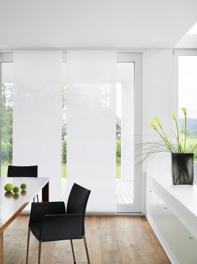 Exploit your full design potential with our Panel Flex system which is suited to a wide range of room layouts. The unique flexible carrier allows the system to be bent so that panels can glide smoothly and silently around tight corners, allowing panels to be stacked away from the window. As a room divider Flex can be designed to create unique shaped spaces within a room.